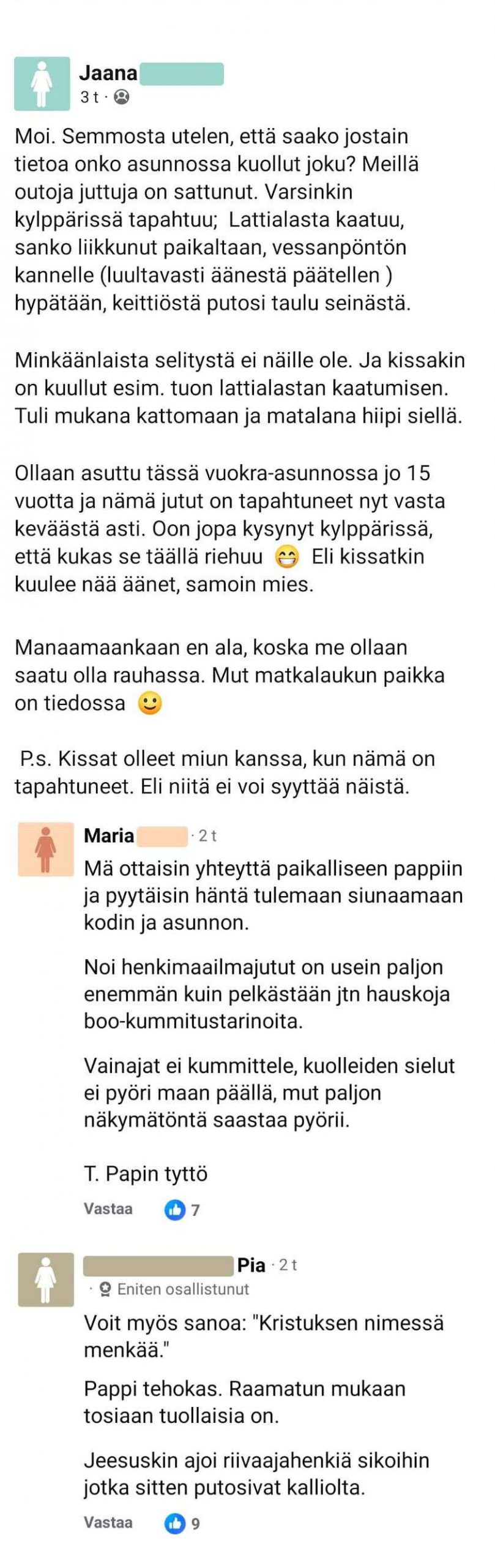 Joku ehdottaa ottamaan yhteyttä pappiin, joka voisi käydä siunaamassa asunnon.