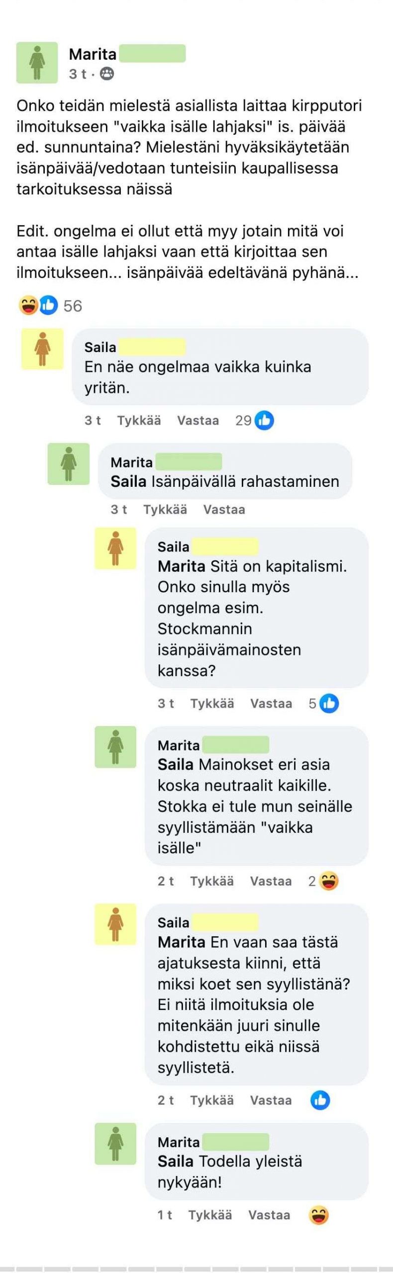 Marita ei pidä siitä, kuinka netin kirpputoreilla mainitaan isänpäivä.