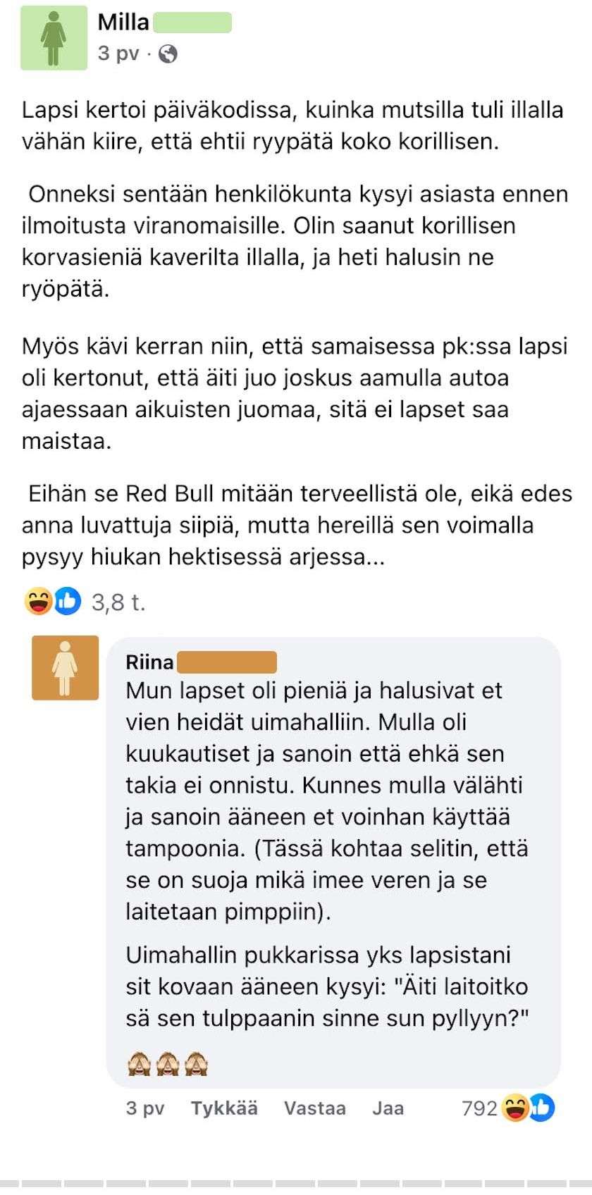 Muutkin innostuvat kertomaan samanlaisia tapauksia, jotka eivät liity kuitenkaan päiväkotiin, vaan muuallekin maailmaan.