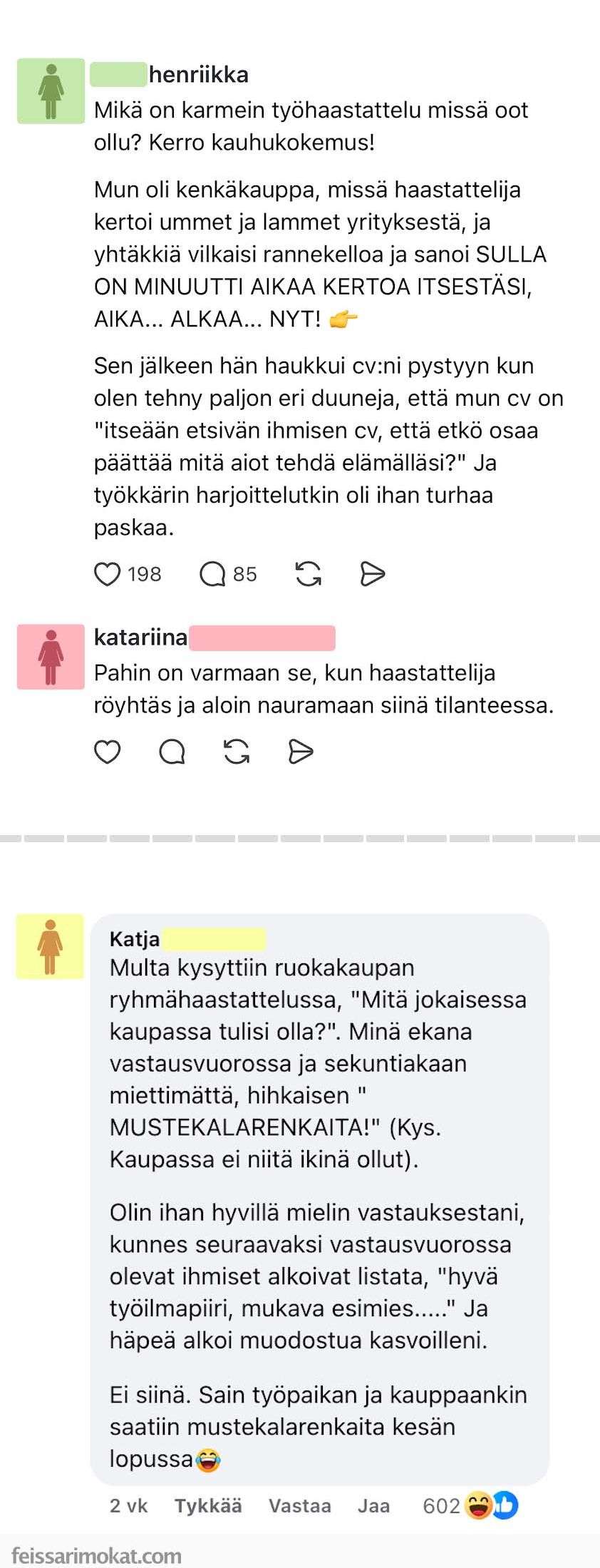 - Feissarimokat: Nämäkö karmeimmat työhaastattelut? – vaikea uskoa