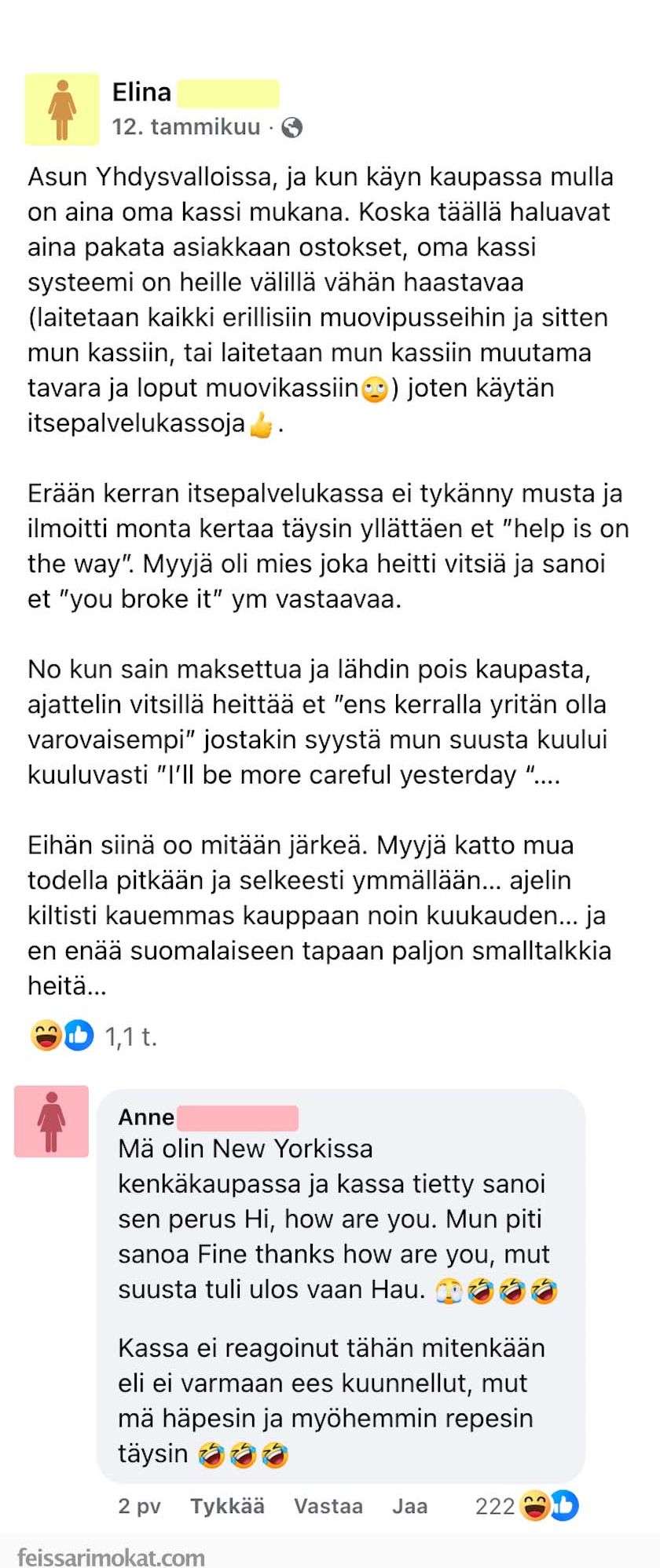 Itsepalvelukassa on paikka, jossa voi olla vaikea mokata? Kyllä ilmeisesti voi, joka selviää Feissarimokat-sivustolla olevasta julkaisusta.