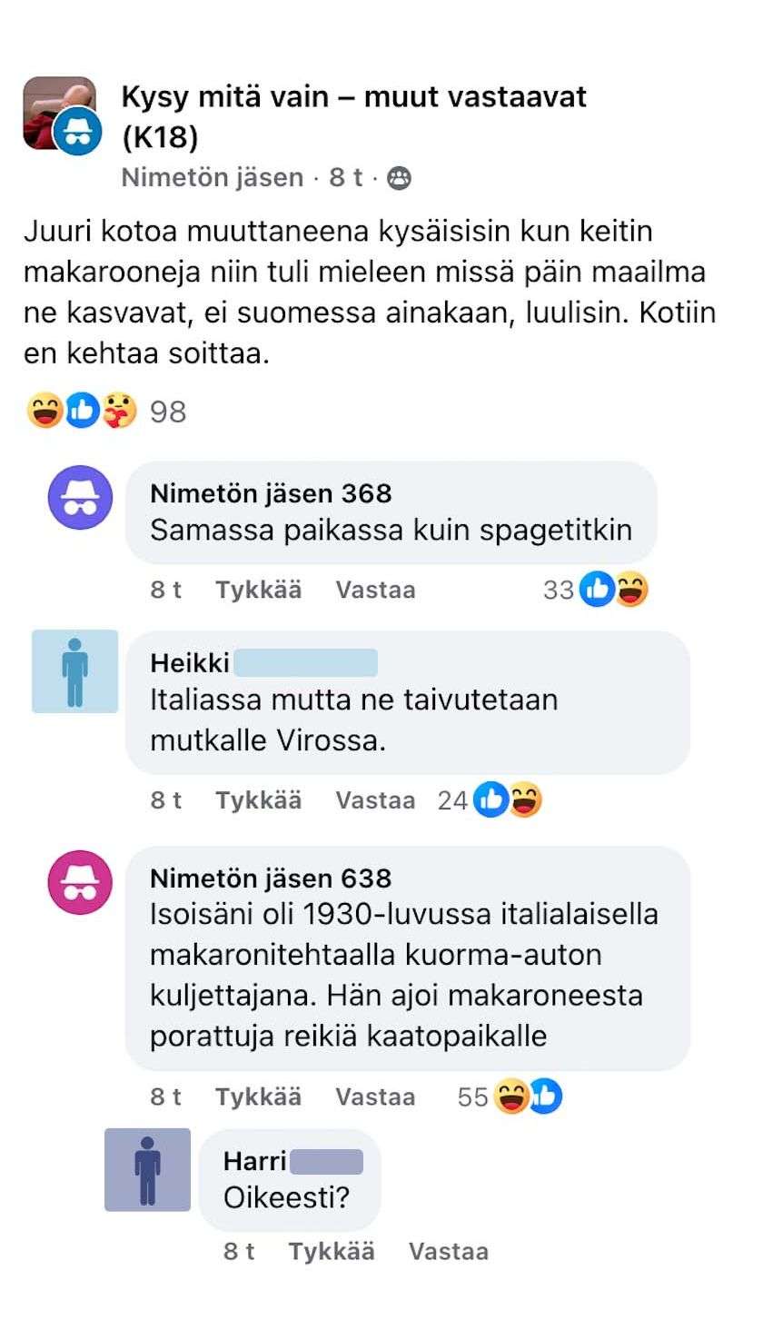 Hän on saanut jo vastauksen, joten nyt me kaikki tiedetään, missä makaronit kasvavat. Katso vastaus tästä alta.