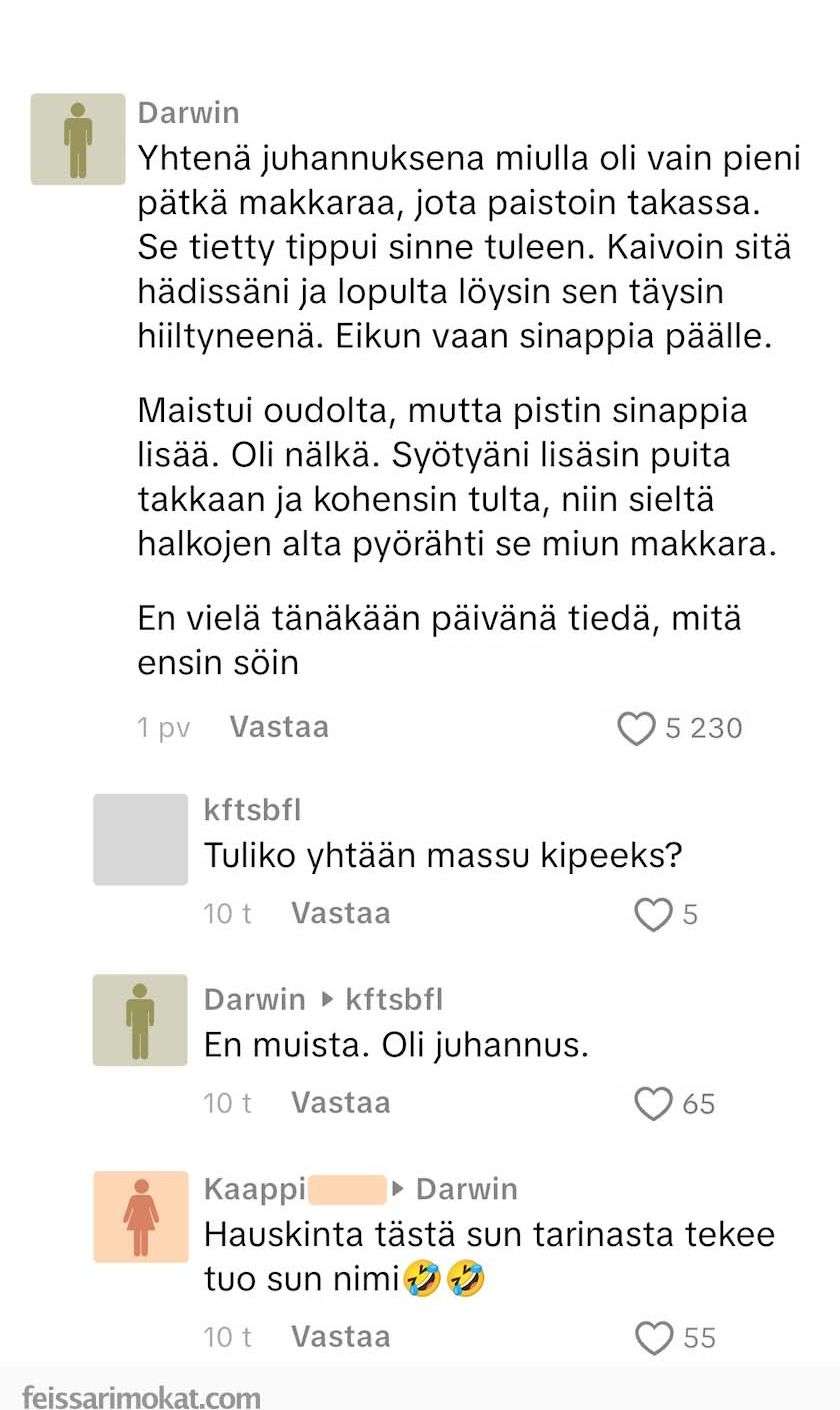 Kun makkara oli syöty, huomasi hän makkaran olevan edelleen takassa. Hän ei tiedä vielä tänä päivänäkään, mitä hän söi.