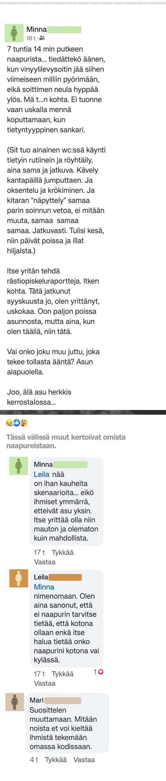 – Itsellä oli myös ehkä noin vuoden ajan yläkerran naapuri, jonka elämän äänet tuli katosta läpi. Ei muiden naapureiden, vain hänen. Aina kun hän käveli asunnossa, niin kuului tömistely. Oli aivan uskomatonta, miten joku voi kävellä niin kova äänisesti. Sitten hänellä oli juuri tapana elää ilta myöhään ja aikaisin aamusta. Eli oli hiljaa yleensä päivällä mutta kun alkoi hiljaisuuden aika niin sitten alkoi töminä ja kaverit tuli käymään jne. Onneksi muuttanut pois niin tullut taas rauha taloon, esittelee joku pitkän tarinansa naapuristaan.