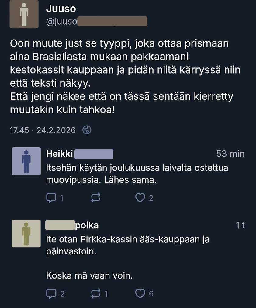 Joku kertoo käyneensä risteilyllä ja hänen kauppakassinsa on ostettu sieltä. Onko se liian läheltä vai voiko silläkin leuhkia muille?