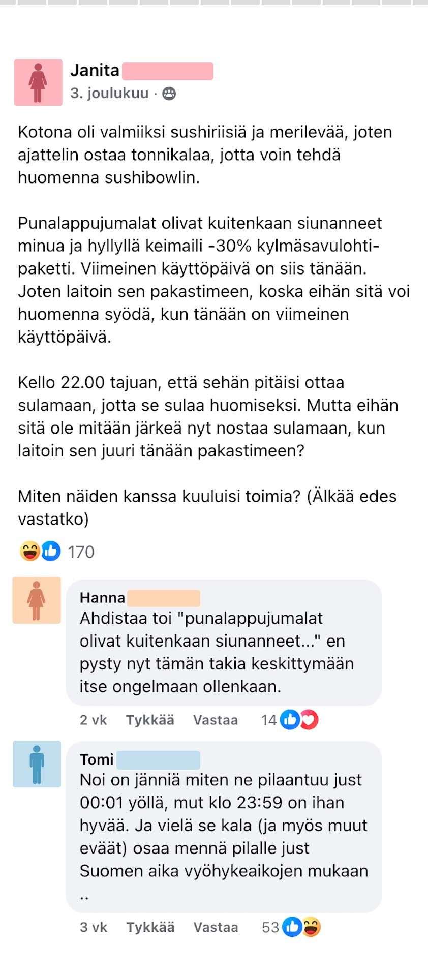 Lohen viimeinen käyttöpäivä oli jo samana päivänä, kun Janista osti sen. Hän aikoi tehdä siitä ruokaa vasta seuraavana päivänä ja laittoi sen pakastimineen.