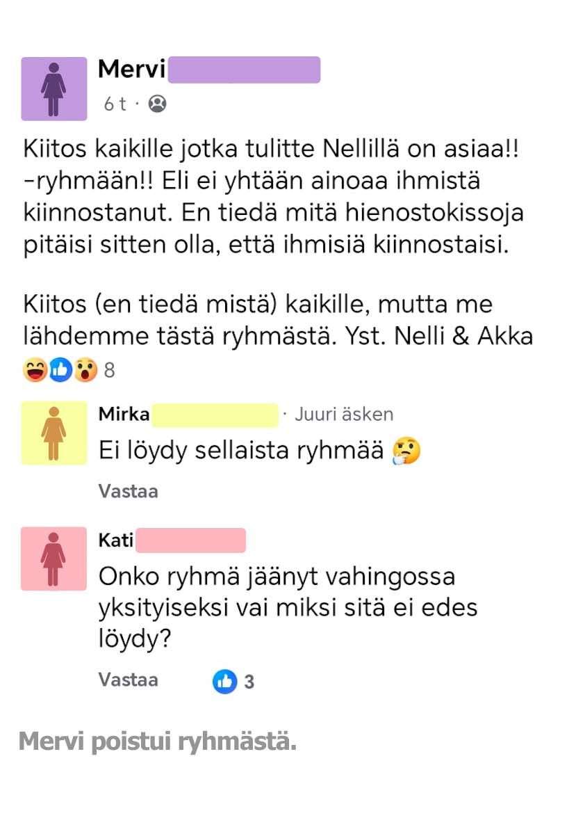 Oli tätä ryhmää luotu tai ei, nyt sitä ei ehkä enää ole. Mervi suuttui ja poistui! Oliko hän oikeasti edes kissaihminen?