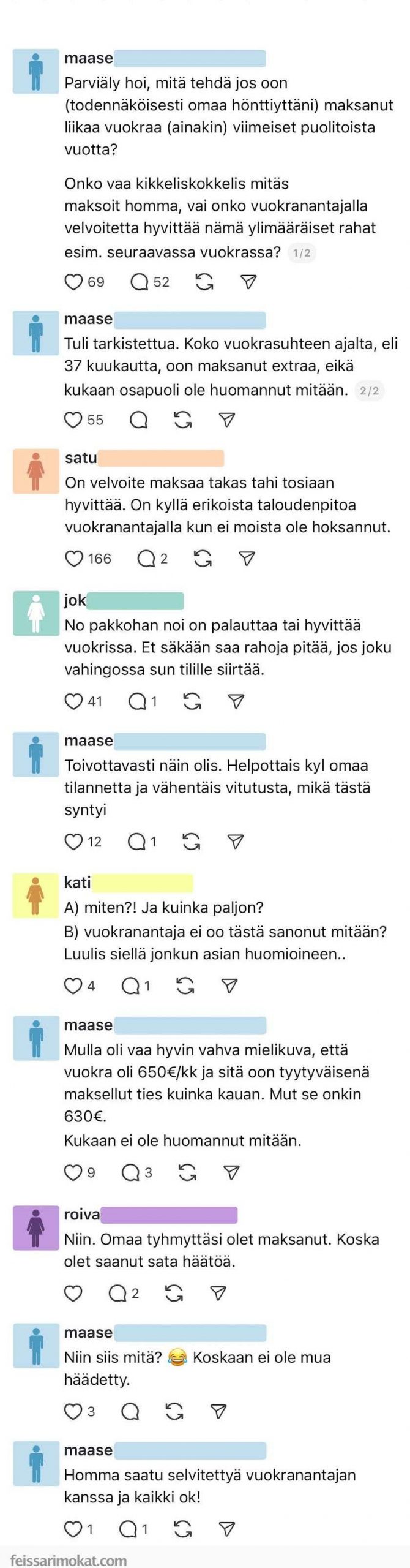 Joku on maksanut liikaa vuokraa ja huomannut sen nyt. Hän kysyy muilta neuvoja ja mielipiteitä siitä, saako hän ylimääräisen maksamansa rahan takaisin.