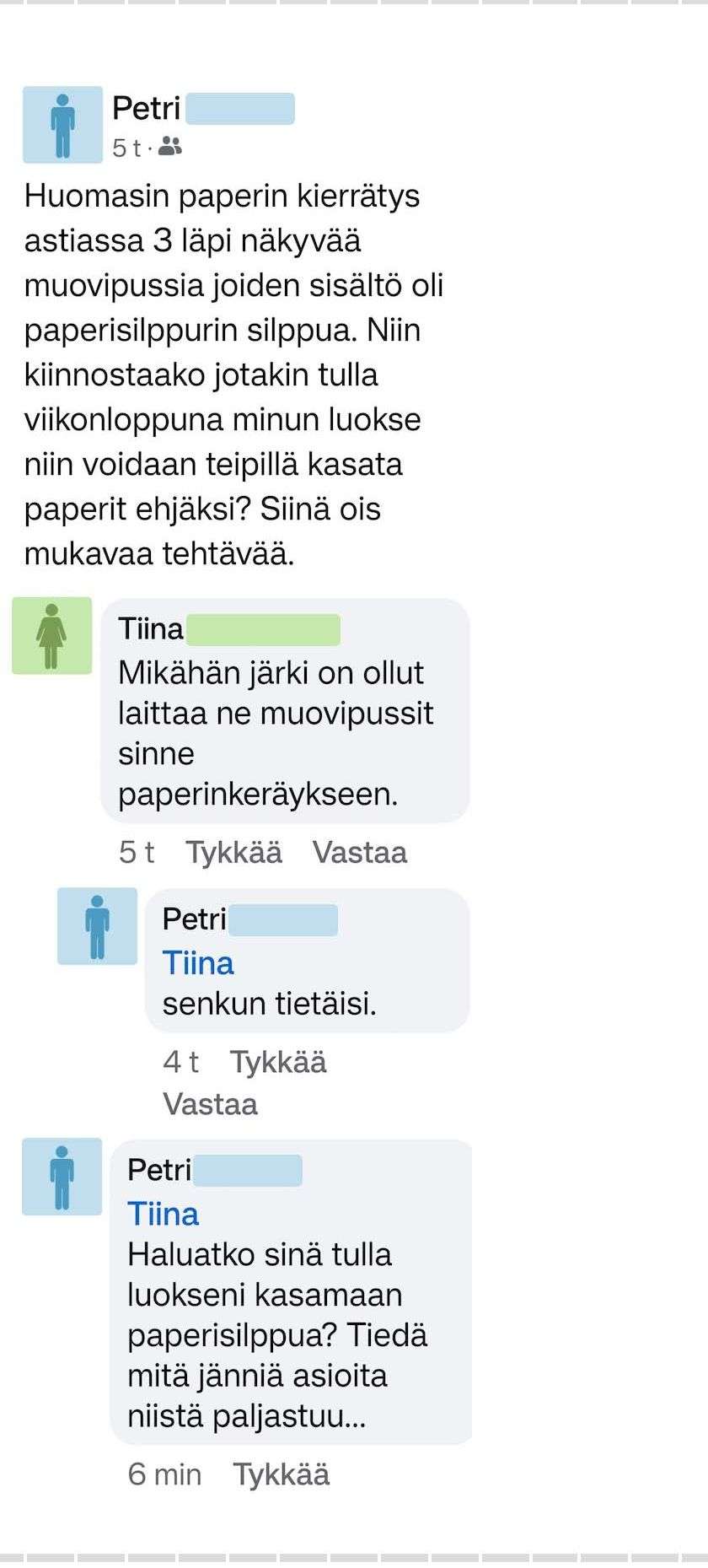 – En oikein sisäistänyt ensin Petrin tekstin sanomaa, kun keskityin löytämään kirjoitusvirheitä. Vähän kuin sellainen tehtävä, jossa etsitään kuvista hassuja yksityiskohtia. Ja petrien varalta laitan tietosuojatun paperin mielummin palamaan kuin paperinkeräykseen. Helpompi on kyllä kastella ja rytätä paperit, niitä ei saa enää auki riittävän siististi, toteaa joku.