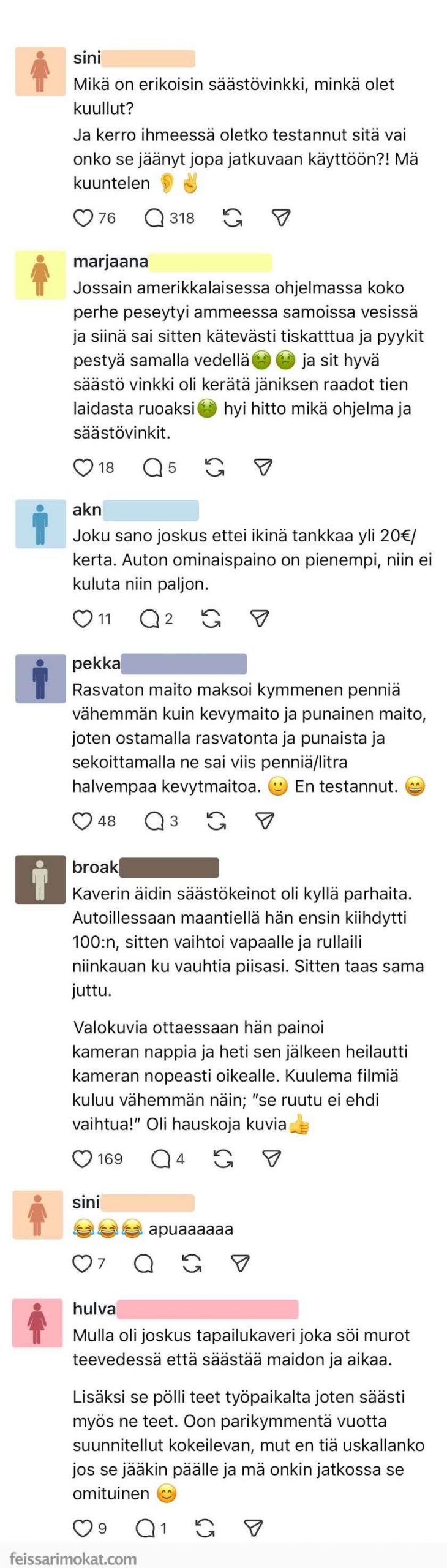 Oikeastaan kaikki vastaukset eivät ole hyviä säästövinkkejä. Ne ovat joko iljettäviä tai naurettavia vinkkejä.